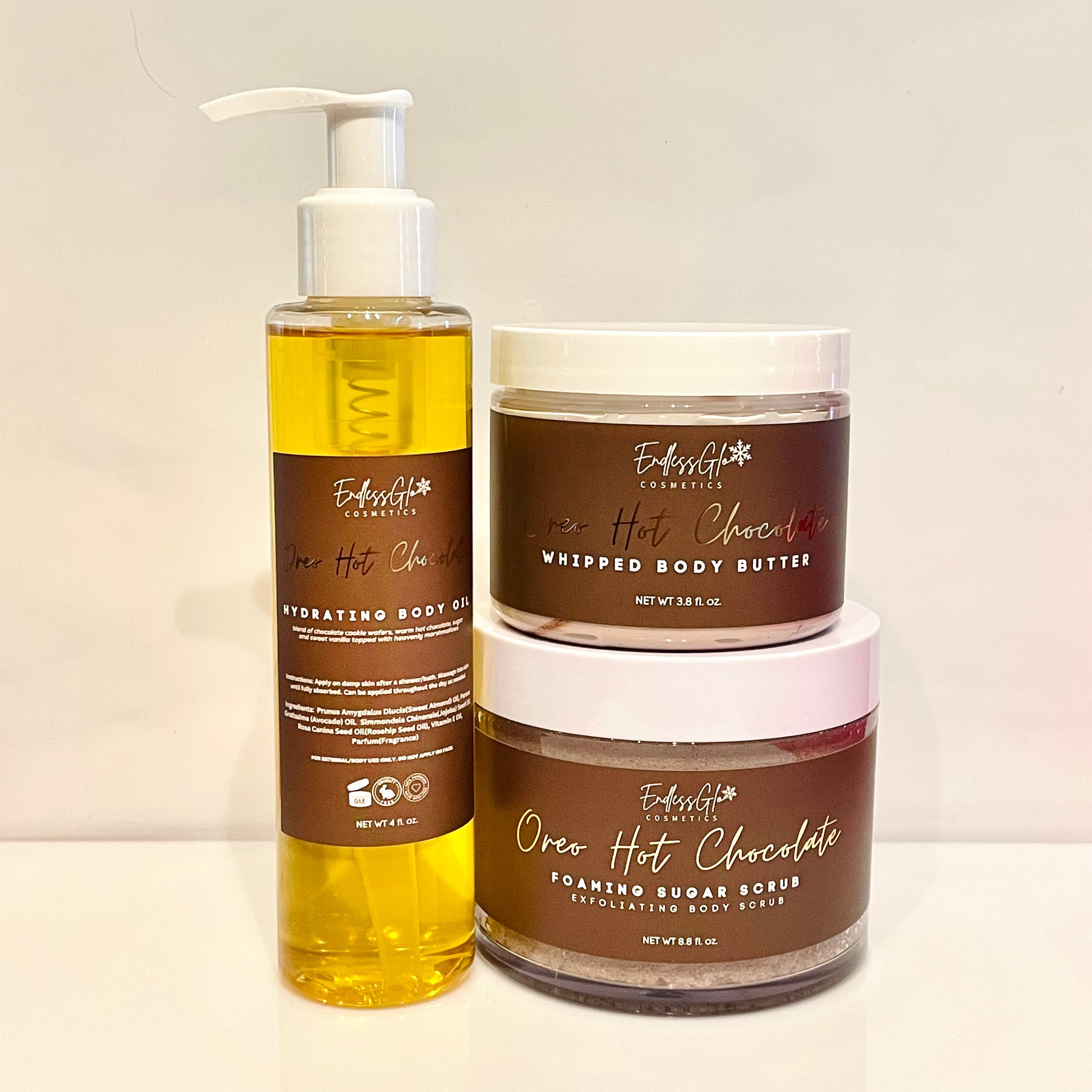 Grab this 3 step bundle for the silkiest and softest skin ever! This bundle will have you smelling like a sweet blend of chocolate cookie wafers, warm hot chocolate, sugar and sweet vanilla topped with heavenly marshmallows